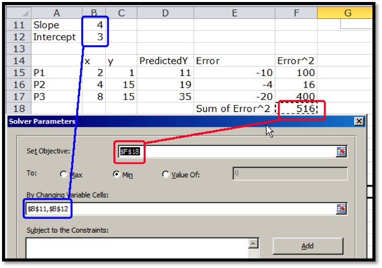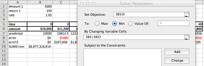 Next we use Solver to minimize the sum of the errors.