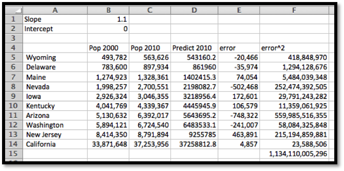 We set up a spreadsheet in the same way we set it up in the last example. For an initial slope we will start with 1.1 for 10% growth. For a starting point we will guess an intercept of 0. As we did in the last example, the predicted population in 2010 is the slope times the population in 2000 plus the intercept. We add extra columns for the predicted population, the error between the prediction and the actual population, the square of the error. At the bottom of the last column, we add the squared errors. This gives the value we want to minimize.