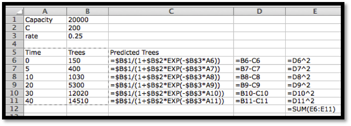We then use Solver to minimize cell E12, by changing cells B1:B3. Our solution indicates that \(\Capacity=14996\text{,}\)\(C=99.93\text{,}\) and \(\rate=0.200\text{.}\)
