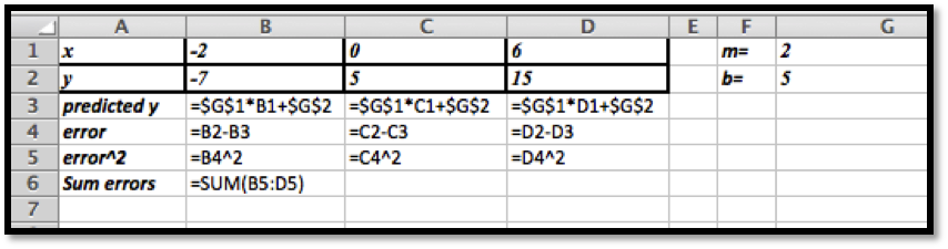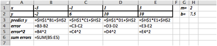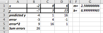 The data ranges from \((-3,-2)\) to \((3,10)\) which suggests a slope of \(m\approx (10-(-2))/(3-(-3) )=12/6=2\text{.}\) Looking at the data near the \(y\)-axis suggests an initial guess of \(b\approx 7.5\text{.}\) So we would start with an Excel sheet like this: