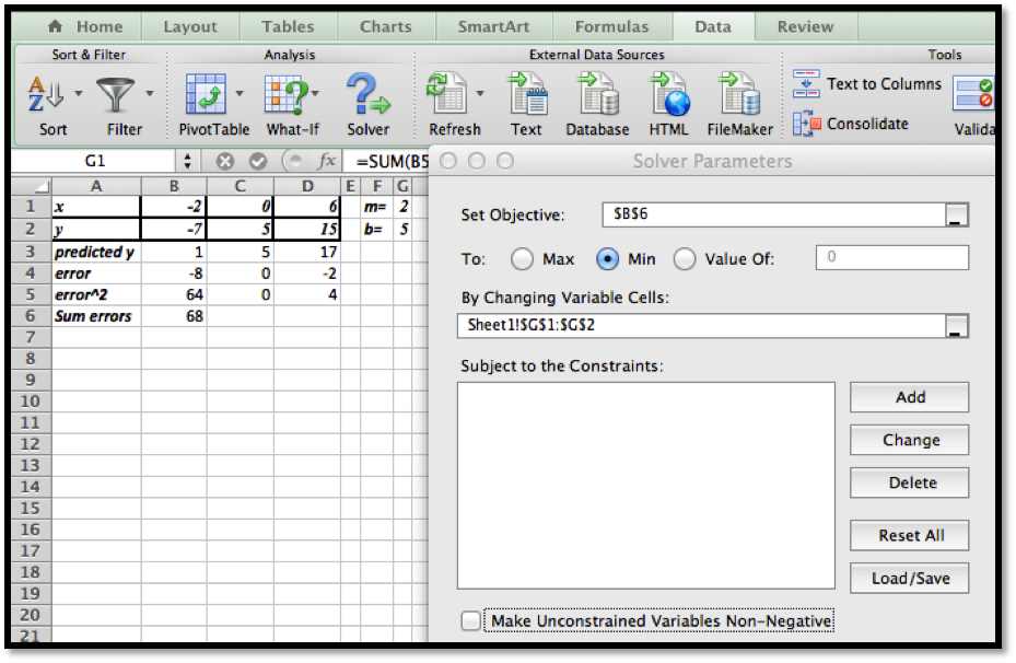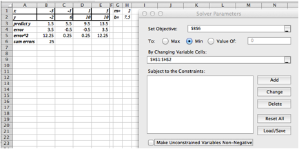 We started with \(m=2\) and \(b=5\) (somewhat arbitrary choices). We unchecked the constraint that the variables should be non-negative (\(m\) and/or \(b\) could theoretically be negative).