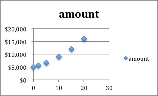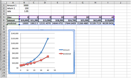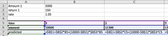 The function we are looking for has a linear component (\(\Amount_1+\Return_1*|time\)), and an exponential component. There is no trendline that would do this for us.