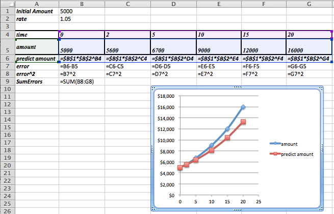 The rate is our final parameter. This is the growth due to interests. We will start with a guess of \(rate = 1.05\text{.}\)