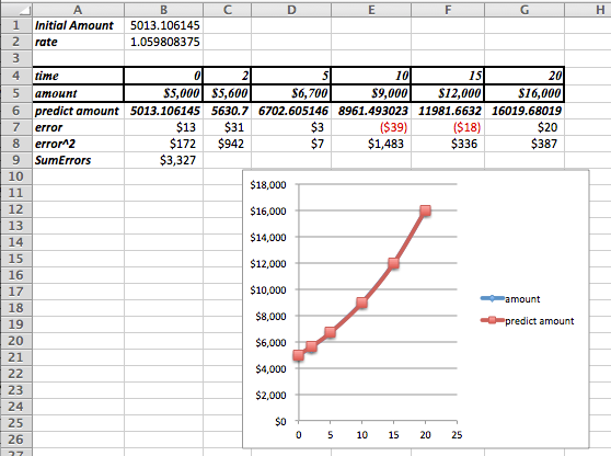 Remark: If we use Trendlines to find a exponential function that fits the data, we would get \(y=5001 e^{0.0583*time}\text{.}\) The least square error analysis shows that this is not as good of an approximation as the one we just found using Solver! The least squares error for the trendline is approximately 30% greater than for the value we found using Solver.