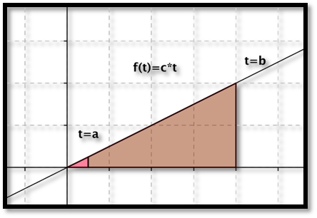 Let \(f(t) = c*t\text{.}\) For a linear function, \(f(t) = c*t\text{,}\) the area under the curve from 0 to \(b\) will be the area of a triangle of height \(c*b\) and width \(b\text{.}\)