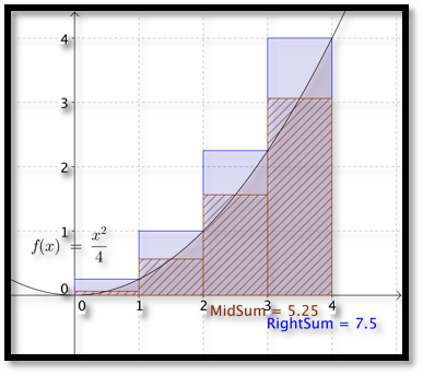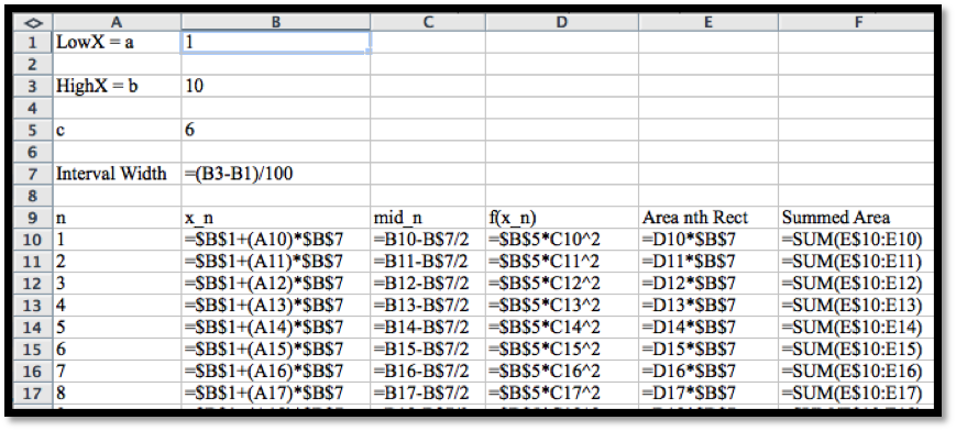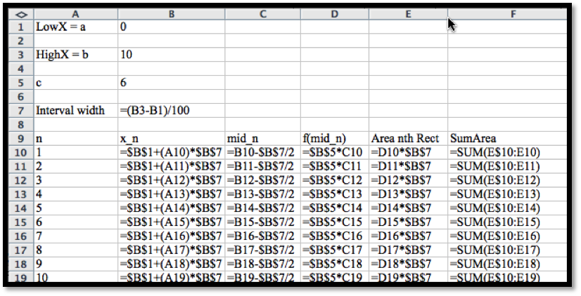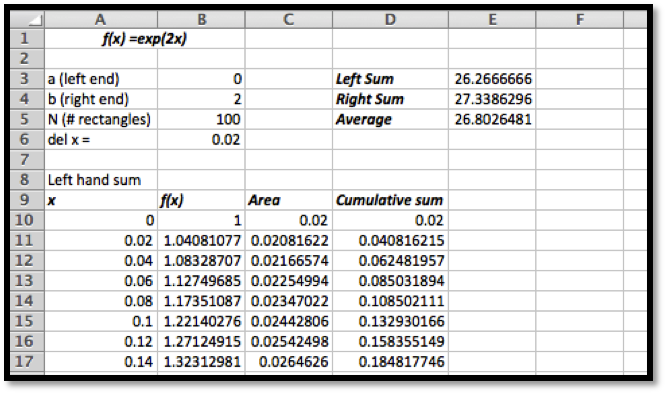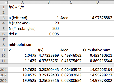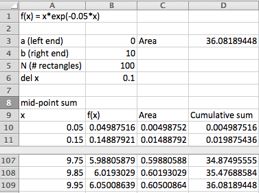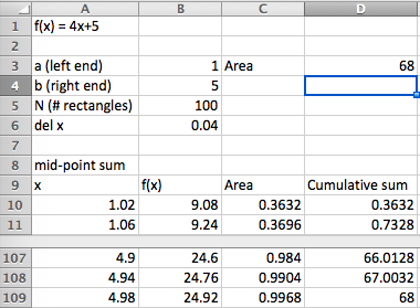 As we consider finding area with Excel and Riemann sums, rather than use a right-hand rule for the rectangles, we are going to use a midpoint rule where we find the area of rectangles evaluated at the middle of each interval.