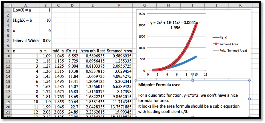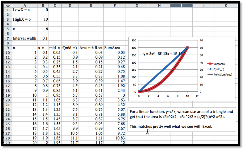 Column C has our list of \(t\) values in the center of each interval. Column D has the value of \(f(t)\) evaluated at those points. The area of the rectangle is the height \(f(mid_n)\) times the width, Interval width. SumArea is our running area function. When we plot the area function, we have something that seems to be quadratic with leading coefficient \(c/2\) and very small linear and constant coefficients. In fact, the linear and constant coefficients are zero up to a rounding factor for numbers of the size we are using.