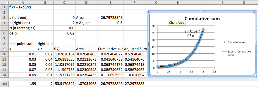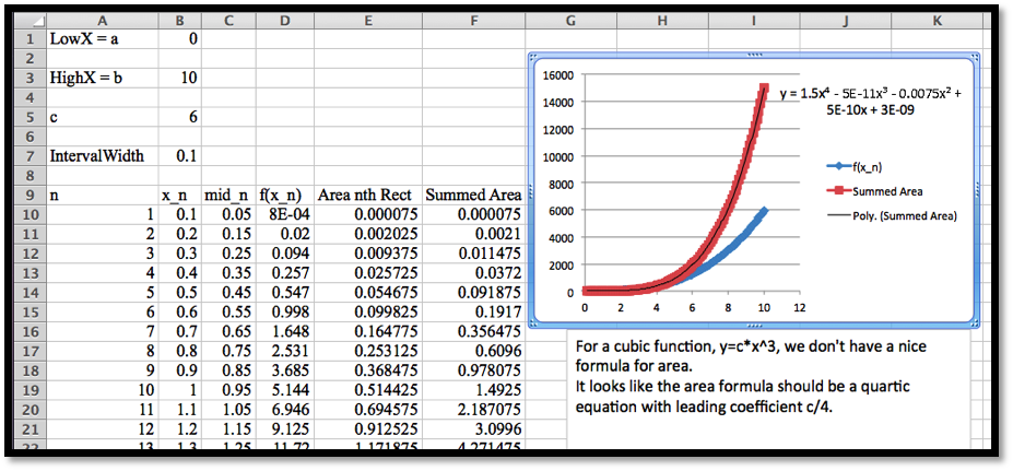 In both of the examples we have examined the area function has the original function as its derivative. We would like to use Excel to test a few more cases. In the worksheets we set up in the last section, SumArea is the area function we are looking for. We will plot the area function and use a best-fit curve to find the equation of the area function.