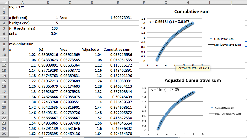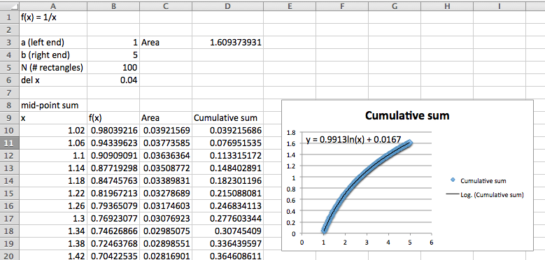 Using Excel and 100 subintervals of \(1 \le x \le 5\text{,}\) compute an approximate area function for \(f(x)\text{.}\) Find a best fitting curve that fits the data well. (It may help to use a secondary axis for the area data.)