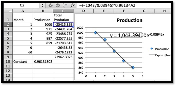 The total production for 5 years will be the definite integral of the production function for the first 60 months. We first use Excel to find a best fitting exponential function.