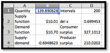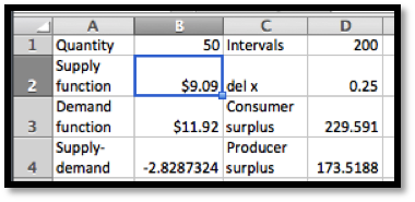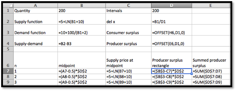 Example 7.8.2. With a slight modification if the worksheet from that example we can set it to compute the Riemann sums approximating the surpluses. In particular, we use the demand function for finding the height of producer surplus. (See cell D7.)