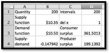 To evaluate these integrals we either use a Riemann sum approximation, like the one found on the example worksheet, or use Wolfram Alpha. In either case, rounded to the nearest dollar, we have a consumer surplus of $372 and a producer surplus of $191.