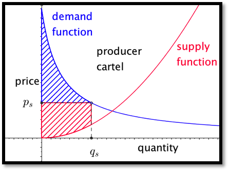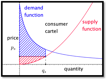 Similarly, if the consumers form a cartel, they can artificially reduce the demand. Since they will then pay the supply price the total social gain will be decreased, but the consumers’ surplus may be increased. In this case the consumer surplus is the integral of the difference between the demand function and the supply price of the quantity that will be sold.