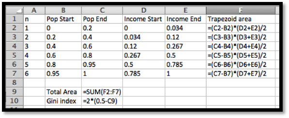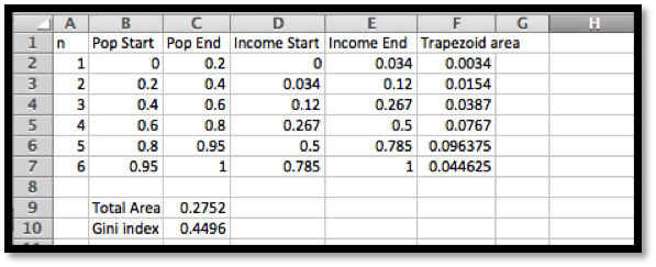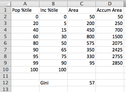 Thus the bottom 50% of the population earns 20.% of the total income. To compute the Gini index, we compute: