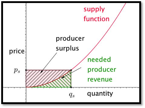 In a similar manner, we can focus on the producer side. The area under the supply function, from 0 to the quantity sold, measures the producers’ need for revenue. The area in the rectangle with that same base and height equal to the sale price measures the actual producer revenue. The difference between the two is a quantity we will call producer surplus.