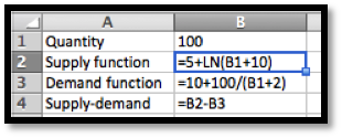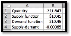 We load the supply and demand price functions into excel and use Goal Seek to find an equilibrium price. Rounding to the nearest unit for quantity and cent for price, we have an equilibrium price of $10.45 for a quantity of 222 shirts.