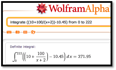 \text{consumer surplus}\amp = \int_0^{222} ((10+100/(\quantity+2))- 10.45)\, dq\\