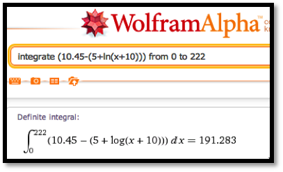 \text{producer surplus}\amp =\int_0^{222} ( 10.45-(5+\ln (\quantity+10))) \, dq\text{.}
