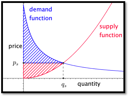 \text{consumer surplus}= \int_0^{q_s} (\text{demand function}(q)- p_s )\, dq